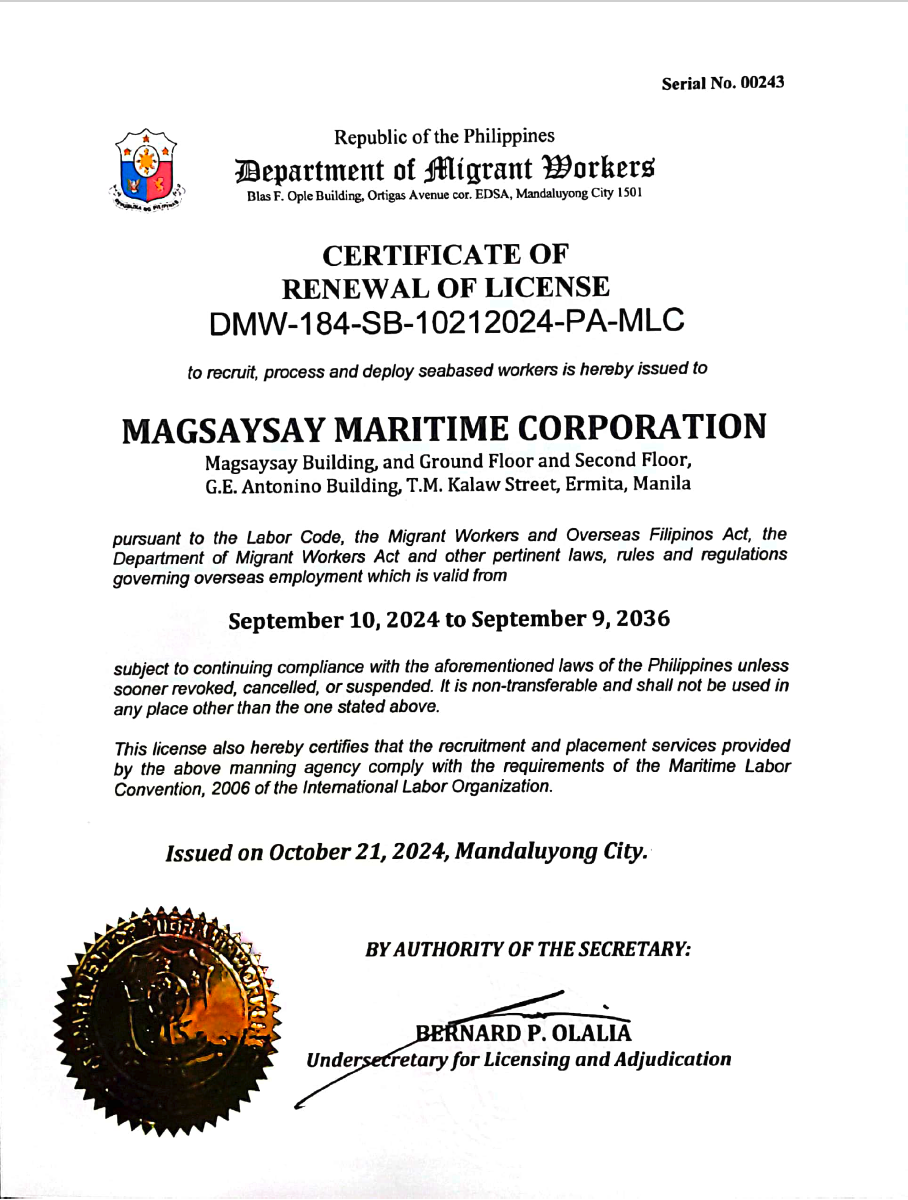Magsaysay Maritime Corporation has successfully renewed its license as a Recruitment and Placement Agency, fully compliant with the Department of Migrant Workers’ (DMW) regulations governing the deployment of seafarers abroad, as well as the Maritime Labour Convention of 2006.
